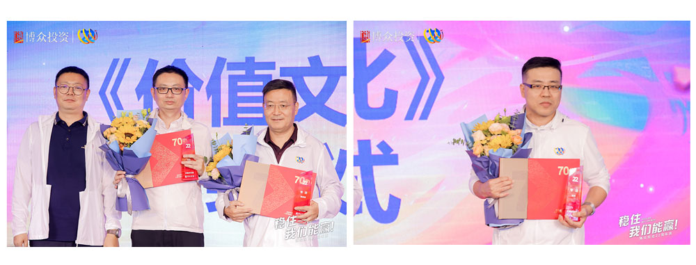 頒發博眾文化價值獎——個人獎。榮獲本屆“專注獎”的是來自博眾的劉冰老師、陳宗寶老師以及林杰老師。榮獲本屆“創新”獎的是陳細幫、張銘亮兩位博眾創新先鋒。最后一個獎項是“以客戶為中心”獎,獲得該項殊榮的,是來自博眾的孫文勝老師與劉開斌老師。均由廣東電視臺經濟科教頻道副總經理侯金龍先生為以上獲獎老師進行頒獎并合影留念。